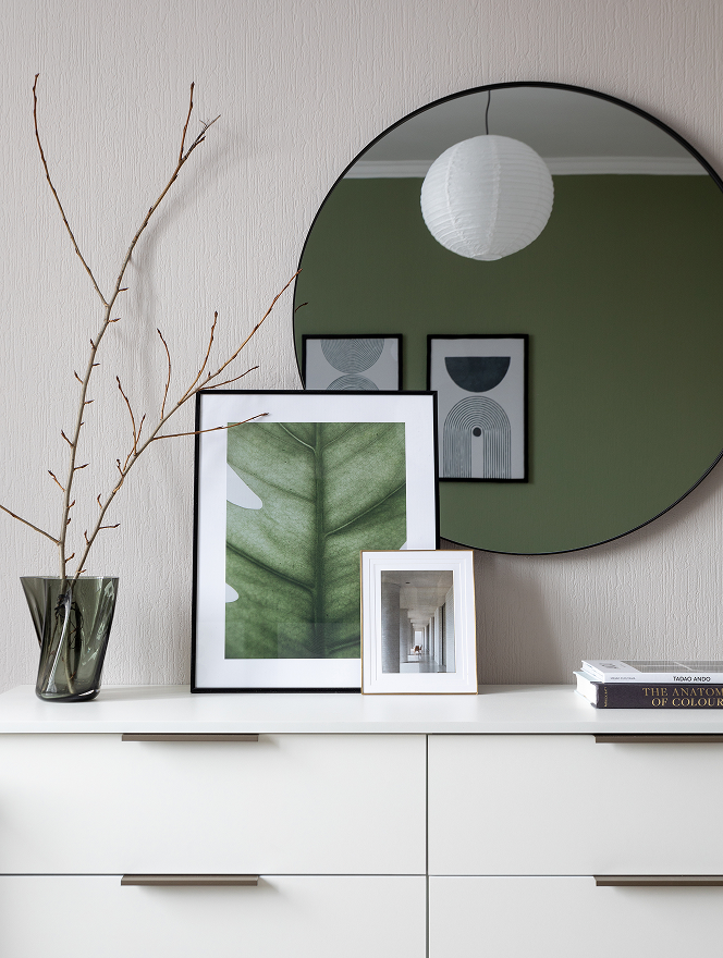 Поэтому было принято решение выкрасить акцентную стену в приглушенный зеленый. На таком фоне гармонично смотрится бежевая обивка. Оттенок выбран «легкий», светлый, чтобы можно было цветом постельного белья менять настроение комнаты.