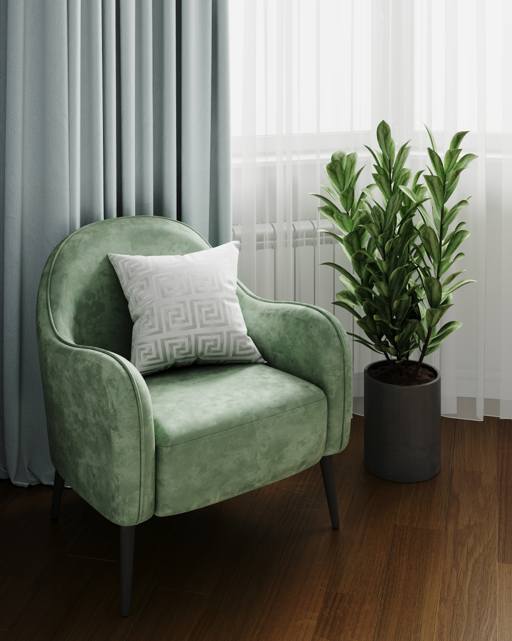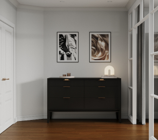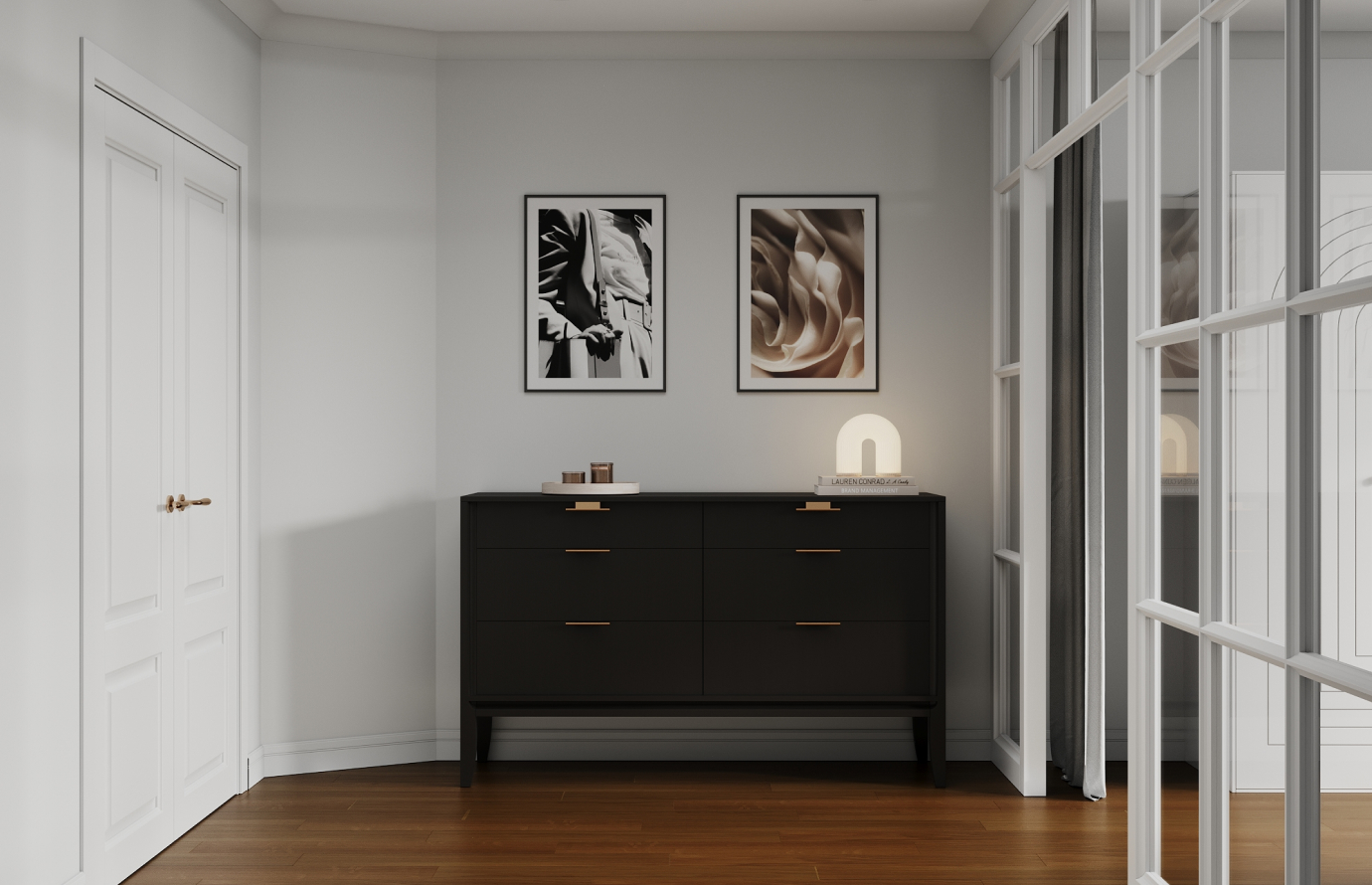 Заказчица — преуспевающий дизайнер одежды, которая много работает из дома. По этой причине при разработке концепции спальни, нам было важно разграничить помещения таким образом, чтобы исключить внешние раздражители, создав спокойную, но при этом рабочую атмосферу в зоне кабинета